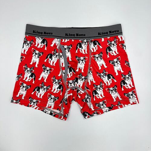 フレンチブルのイラストが全体に描かれたボクサーパンツです。こちらは前開きタイプのもの。